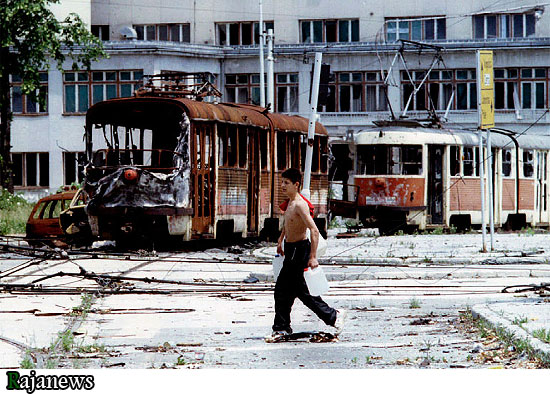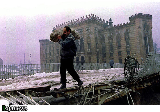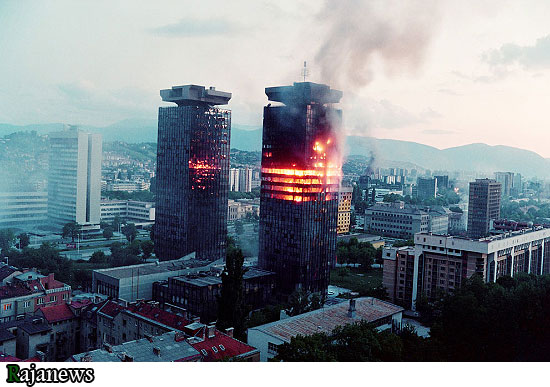 فروریختن برجهای دوقلو بر اثر توپخانه سنگین صرب ها در مرکز شهر سارایوو