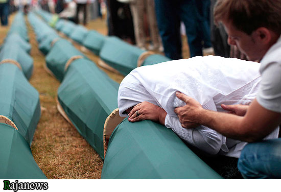 گریه یک زن مسلمان بر روی تابوت یکی از بستگانش که از گورهای دسته جمعی کشف شده است