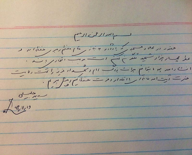 دکتر سعید جلیلی که روز پنج شنبه در مسجد ابوذر واقع در جنوب غربی تهران حاضر شده بود، پس از سخنرانی در جمع مردم چندخطی در دفتر یادبود مسجد ابوذر به رسم یادگار نوشت.