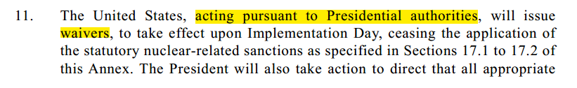 همانگونه که مشاهده میشود دولت آمریکا متعهد شده است تا بر اساس اختیارات رئیس جمهور در توقف تحریمها، این کار را انجام دهد. در متن انگلیسی مشاهده میشود که به پدیدهای با نام «waivers» اشاره شده است. «ویور یا صرفنظر کردن» از اجرای قانون، اختیاری است که در قوانین آمریکا برای رئیس جمهور آمریکا در نظرگرفتهاند تا در صورت احساس نیاز دولت از اجرای قانون صرفنظر کند. البته این رویه حقوقی در آمریکا بی حساب و کتاب نیست و «صرف نظر کردن» از اجرای قانون دارای ضوابط مشخصی است.