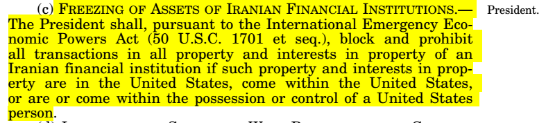 برای این بند که بر اساس آن داراییهای موسسات مالی ایرانی و بانک مرکزی ایران در آمریکا بلوکه میشود، قابلیت استفاده از اختیار «صرفنظر کردن» دیده نشده است و اختیاری برای رئیس جمهور آمریکا در این زمینه در نظر گرفته نشده است.