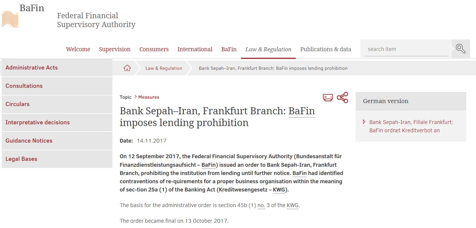 تحریم پشت تحریم در پسا برجام / ژرمن ها با تحریم بانک سپه، کاتسا قانون تحریم امریکایی را اجرایی کردند + سند از اداره نظات مالی دولت فدرال آلمان