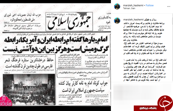 به گزارش رجانیوز به نقل از باشگاه خبرنگاران جوان، مرضیه هاشمی خبرنگار و مستندساز آمریکاییالاصل شبکه پرس تیوی نسبت به اظهارات علی ربیعی سخنگوی دولت درباره مصاحبه مایک پمپئو وزیر خارجه آمریکا با این خبرنگار واکنش نشان داد و تأکید کرد خطش خط امام است، نه یک قدم جلوتر و نه یک قدم عقبتر.