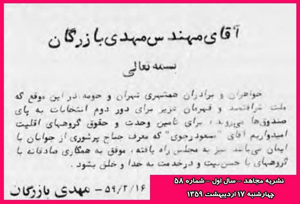 در اعلامیهی بازرگان آمده بود: «خواهران و برادران همشهری تهران و حومه، در این موقع که ملت شرافتمند و قهرمان عزیز برای دور دوم انتخابات به پای صندوقها میروند برای تامین وحدت و حقوق گروههای اقلیت امیدواریم آقای "مسعود رجوی" که معرف جناح پرشوری از جوانان با ایمان میباشد نیز به مجلس راه یافته، موفق به همکاری صادقانه با گروههای با حسن نیت و در خدمت به خدا و خلق بشود.»