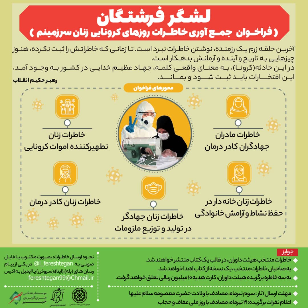 فراخوان ملی لشگر فرشتگان، جمعآوری خاطرات کرونایی زنان سرزمینم در ۵ محور با عناوین: خاطرات زنان تطهیرکننده اموات کرونایی، خاطرات زنان کادر درمان و اورژانس، خاطرات زنان جهادگر در تولید و توزیع ملزومات و مواد ضدعفونیکننده، خاطرات زنان خانهدار در حفظ نشاط و آرامش خانوادگی و خاطرات مادران و همسران کادر درمان و اورژانس میباشد.