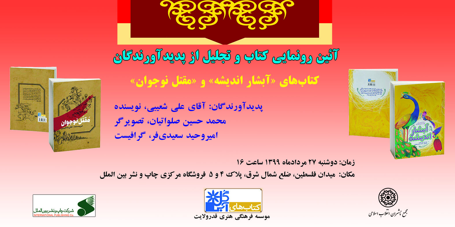 برنامه رونمایی از این دو اثر و تجلیل از پدیدآورندگانشان، روز دوشنبه ۲۷ مرداد از ساعت ۱۶ در کتابفروشی چاپ و نشر بینالملل واقع در میدان فلسطین شهر تهران برگزار میشود.