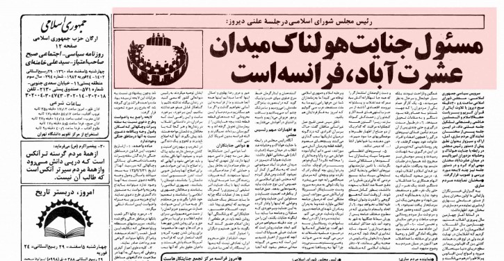 اما از نظر ما در این جنایت همه گروههای ضد انقلاب و محارب به عنوان عامل، مجرمند و مسئول و ریشه جنایت را هم امریکا میدانم و امروز فرانسه، برای اینکه این جنایتکارها امروز در فرانسه جمع شدهاند و مشترکاً توطئه میریزند... فرانسه که مرکز تجمع این جنایتکارها از قبیل بختیار، بنیصدر، رجوی، اویسی، ازهاری و عبور و مرور رضا پهلوی و امثال اینها که ما میدانیم اینها همه آنجا هستند و ما از فرانسه به این آسانی نخواهیم گذشت و اگر ما هم بگذریم مردم ما و این محرومانی که جسدهای قطعه قطعه شده بچههایشان را از بیمارستان تحویل گرفتهاند و به گورستان بردهاند، نمیگذرند و البته فرانسه بدون امریکا کاری نمیکند...