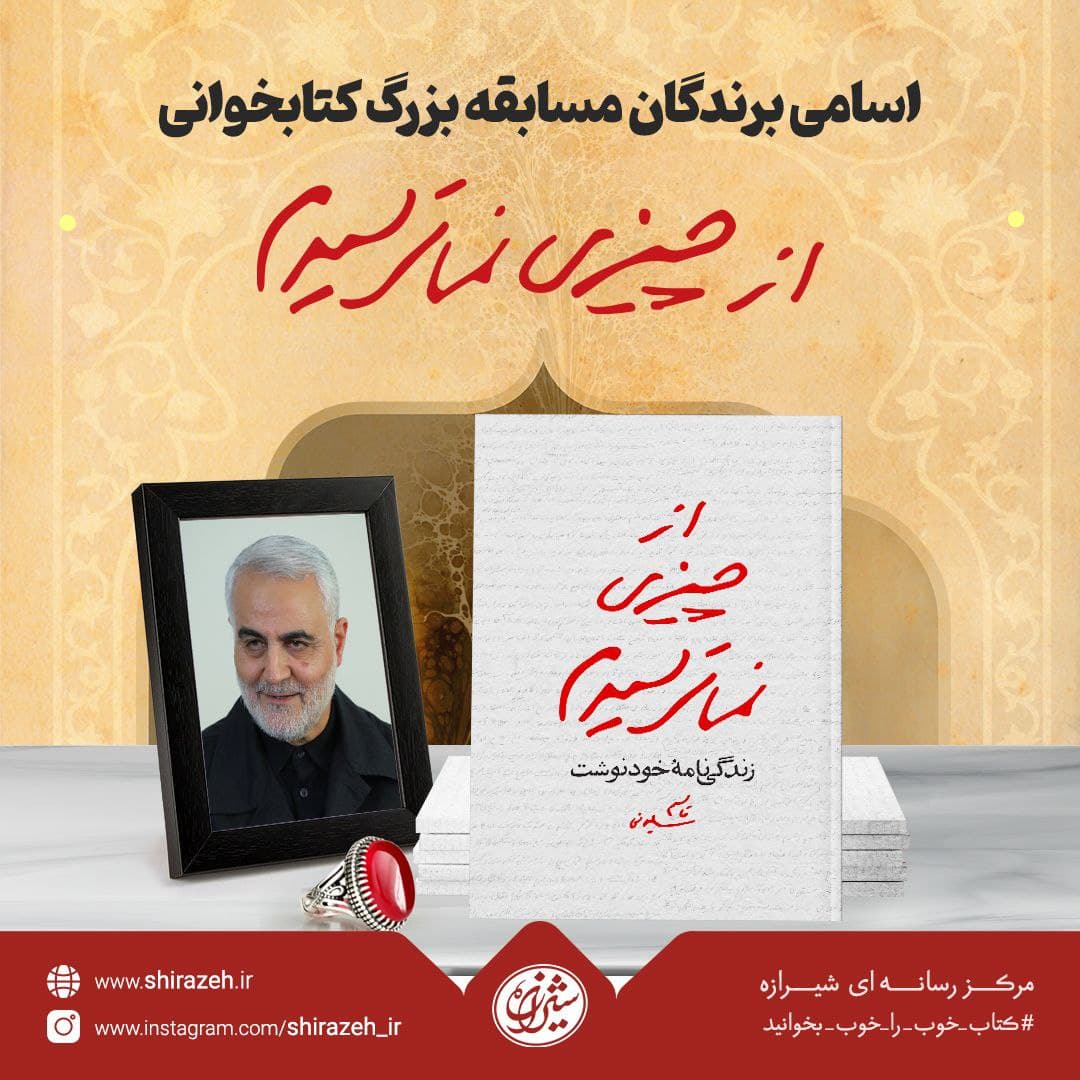 به گزارش رجانیوز ششمین دورۀ مسابقۀ کتابخوانی «کتاب قهرمان» با محوریت کتاب «از چیزی نمیترسیدم»، زندگینامۀ خودنوشت سردار شهید قاسم سلیمانی، از روز شنبه بیستم آذر تا پانزدهم دی، با همکاری مرکز رسانهای شیرازه و انتشارات مکتب حاجقاسم سلیمانی، همراه با دویستمیلیون ریال جوایز نقدی برگزار شد که با قرعهکشی به برگزیدگان اهدا گردید.