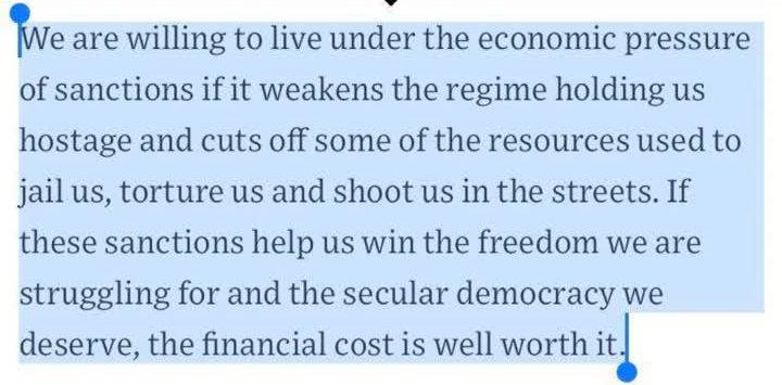 او در این مقاله گفته است:« ما مایل هستیم که تحت فشار تحریم های اقتصادی زندگی کنیم اگر این تحریم جمهوری اسلامی را تضعیف کند... اگر این تحریم ها به ما کمک کند تا آزادی که برای آن تلاش می کنیم را کسب کنیم و به دموکراسی سکولاری که می خواهیم برسیم. هزینه های اقتصادی آن ارزشش را خواهد داشت.»