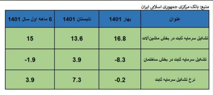 در ۶ماه اول امسال نرخ تشکیل سرمایه ثابت در بخش ماشین‌آلات مثبت ۱۵%ودر بخش ساختمان منفی ۱.۹% بوده است.اما در مجموع نرخ تشکیل سرمایه ثابت در۶ماه اول سال ۱۴۰۱به ۳.۹%رسیده است.