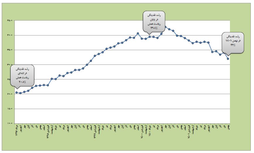 با تغییر رئیس‌کل بانک مرکزی در دولت رئیسی، سیاست کنترل رشد نقدینگی اتخاذ شد و با پرهیز دولت از استقراض از بانک مرکزی، به تدریج رشد نقدینگی کاهش یافت به طوری که طبق آخرین آمار در پایان بهمن سال ۱۴۰۱ رشد نقدینگی به ۳۲ درصد رسید. بدین ترتیب رشد نقدینگی در دولت رئیسی ۱۰ واحد درصد کاهش یافته است.