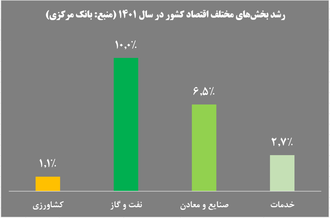 در مجموع عملکرد تولید ناخالص داخلی کشور به قیمت پایه در سال ۱۴۰۱ "با احتساب نفت" و "بدون احتساب نفت" به قیمتهای ثابت سال ۱۳۹۵ به ترتیب به ۱۵۱۵۴.۰ و ۱۳۸۸۱.۸ هزار میلیارد ریال رسید که نسبت به سال قبل از آن به ترتیب با افزایش ۴.۰ و ۳.۵ درصدی همراه بوده است. تحقق رشد اقتصادی ۴.۰ درصدی در سال ۱۴۰۱ در امتداد رشد اقتصادی ۴.۴ درصدی سال ۱۴۰۰، حکایت از تداوم رشد قابل قبول فعالیتهای اقتصادی در کشور دارد.
