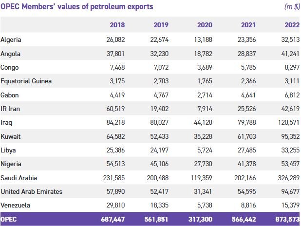 طبق آمار منتشره در بولتن آماری سالانه ۲۰۲۳ اوپک، ارزش صادرات نفتی ایران در سال ۲۰۲۲، به ۴۲.۶ میلیارد دلار رسید که در مقایسه با ارزش صادرات نفتی سه سال گذشته، بالاتر بود.