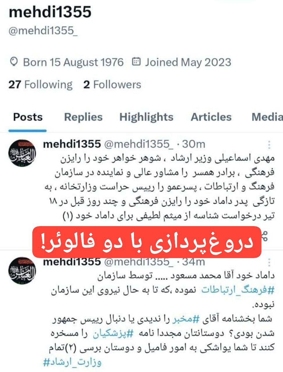 در تازهترین این اقدامات، یک اکانت جعلی با دو دنبالکننده، دروغهای متعددی را علیه وزیر ارشاد مطرح کرده است.