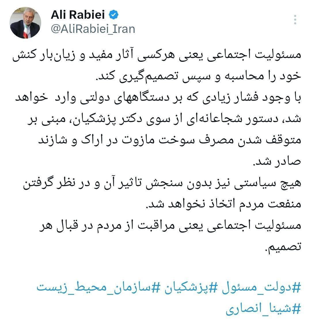 علاوه بر این مهاجرانی در حالی ادعا می‌کند که توقف مازوت سوزی در این سه نیروگاه با تصمیم جمعی کابینه اتفاق افتاده که علی ربیعی دستیار پزشکیان تاکید کرده بود که این اتفاق با دستور پزشکیان صورت گرفته است.