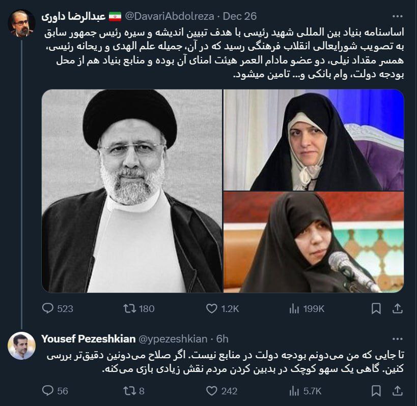 گروه سیاست - رجانیوز: یوسف پزشکیان، فرزند رئیس جمهور در شبکه اجتماعی ایکس در پاسخ به برخی گمانه زنیها درباره بودجه بنیاد شهید رئیسی نوشت: «تا جایی که من میدونم بودجه دولت در منابع نیست اگر صلاح میدونین دقیقتر بررسی کنین. گاهی یک سهو کوچک در بدبین کردن مردم نقش زیادی بازی میکنه.»