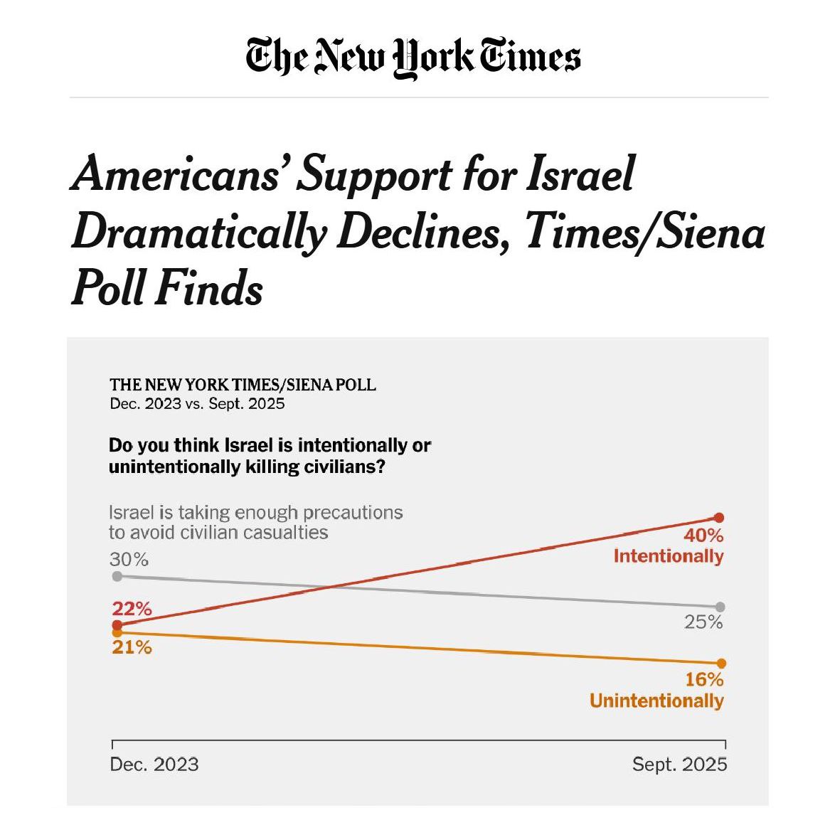 تقریبا دو سال بعد از ۷ اکتبر ۲۰۲۳، ۳۵ درصد از رأیدهندگان آمریکایی اعلام کردهاند که از فلسطینیها طرفداری میکنند و ۳۴ درصد از اسرائیل. از آغاز نظرسنجیهای نیویورک تایمز، این اولین بار است که تعداد طرفداران فلسطین از حامیان اسرائیل بیشتر شده است.