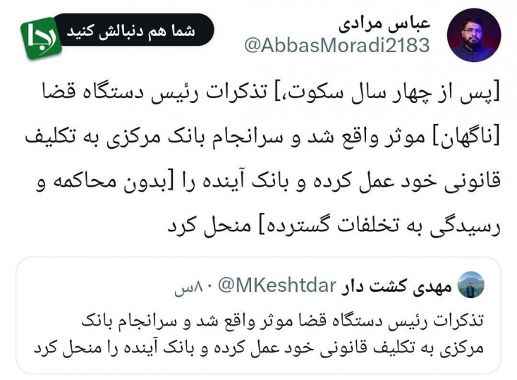 جمعه 2 آبان 1404 ساعت 14:27 جمعه 2 آبان 1404 14:26 ساعت 2025-10-24 14:27:00 عکس شناسه خبر : 387072 یک اصلاحیه بر توییت مدیرعامل خبرگزاری قوه قضائیه! لینک کوتاه » http://rajanews.com/node/387072 لینک کوتاه کپی شد 0 پسندیدم ارسال به » نام شما ایمیل اطلاعات این فیلد خصوصی است و منتشر نمیگردد. وب سایت ۲ بعلاوه ۳ میشود دیدگاه * نظرات حاوی متن تبلیغاتی، متن فارسی با حروف لاتین (فینگلیش)، توهین و الفاظ ناشایست، نمایش داده نخواهد شد.