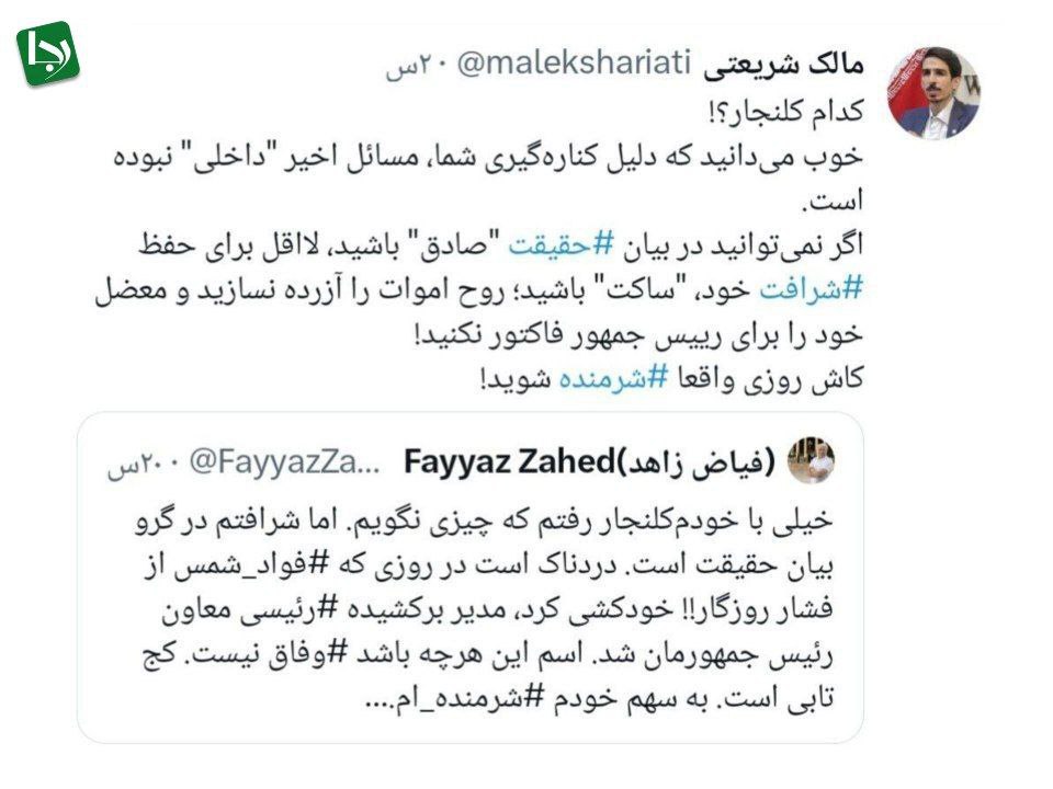 مالک شریعتی، نماینده مجلس در واکنش به این اظهارات نوشت: کدام کلنجار؟! خوب میدانید که دلیل کنارهگیری شما، مسائل اخیر "داخلی" نبوده است؛ اگر نمیتوانید در بیان حقیقت "صادق" باشید، لااقل برای حفظ شرافت خود، "ساکت" باشید؛ روح اموات را آزرده نسازید و معضل خود را برای رییس جمهور فاکتور نکنید! کاش روزی واقعا شرمنده شوید!