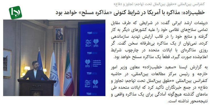 قسمت شگفت‌انگیز دیگری از این مصاحبه خطیب‌زاده آن جاست که می‌گوید: «ایران همواره آمادگی خود را برای مذاکره در چارچوب فرمایشات مقام معظم رهبری اعلام کرده است»! مشخص نیست منظور او رهبر کدام کشور است؛ رهبر انقلاب که از پیش از مذاکراتی که در میانه آن تجاوز نظامی صورت گرفت، نسبت به این عمل بی‌فایده و پرهزینه هشدار دادند؛ «مذاکره با آمریکا هوشمندانه، شرافتمندانه و عاقلانه نیست». «مذاکره‌ای که با تهدید همراه است را هیچ ملت با شرفی انجام نمی‌دهد و هیچ سیاست‌مدار خردمندی هم آن را تصدیق نمی‌کند». «مذاکره با آمریکا بن‌بست محض است» و جملات بسیار دیگری که در همین چند ماه بیان کردند.