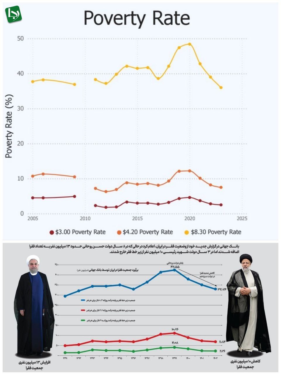 همچنین بالاترین نرخ فقر در ۴۰ سال اخیر مربوط به دولت حسن روحانی ضعیف ترین دولت تاریخ ایران در سال‌های ٩٧ تا ٩٩ با رقم ۴۲.۵ درصد بوده است.
