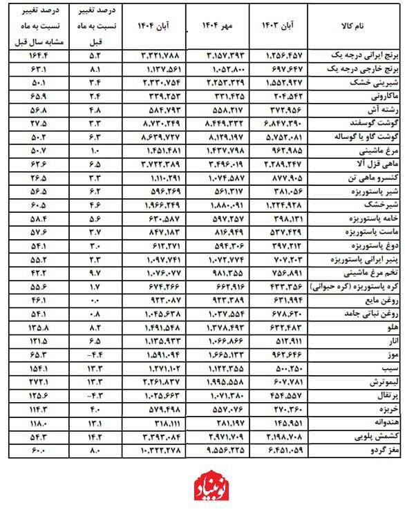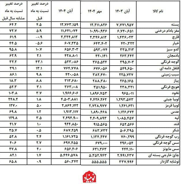 مرکز آمار ایران تغییرات متوسط قیمت ۵۳ قلم خوراکی در مناطق شهری در آبان امسال را اعلام کرد که ۴۱ قلم افزایش قیمتی بالاتر از نرخ تورم نقطهای شهری (۴۸.۶ درصد) داشتند.