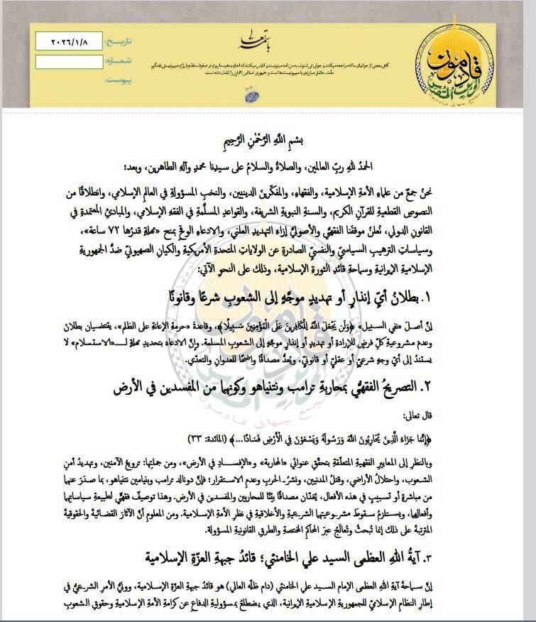 گروه بین‌الملل-رجانیوز: درپی تهدیدات اخیر و عربده‌کشی‌های سیاسی محور شرارت، جمع کثیری از فقها، اندیشمندان و نخبگان مسئول جهان اسلام با صدور بیانیه‌ای قاطع، مواضع فقهی و اصولی خود را در حمایت از جمهوری اسلامی ایران اعلام کردند.