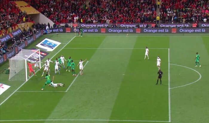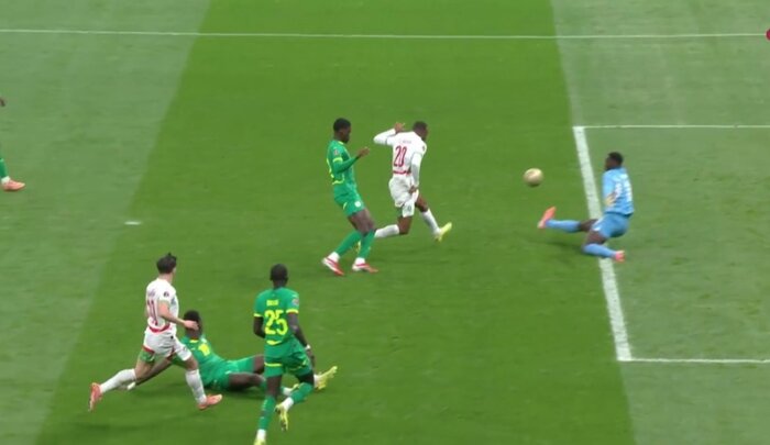 در ادامه براهیم دیاز روی ارسال کرنر اشرف حکیمی توسط مدافع سنگال در محوطه جریمه سرنگون شد؛ ابتدا داور اعتقادی به خطا نداشت اما بعد از اعتراض شدید دیاز و بازبینی صحنه در میان اعتراضات و جنجال‌های زیاد اعلام خطای پنالتی کرد. بعد از این تصمیم، بازی چند دقیقه متوقف بود و حتی سرمربی سنگال تیم را از زمین بازی بیرون کشید و سنگال در عین ناباوری در فینال این رقابت‌ها زمین را ترک کرد و به رختکن بازگشت. در نهایت تلاش‌های سادیو مانه، ستاره سنگال جواب داد و بازیکنان این تیم به زمین بازگشتند.
