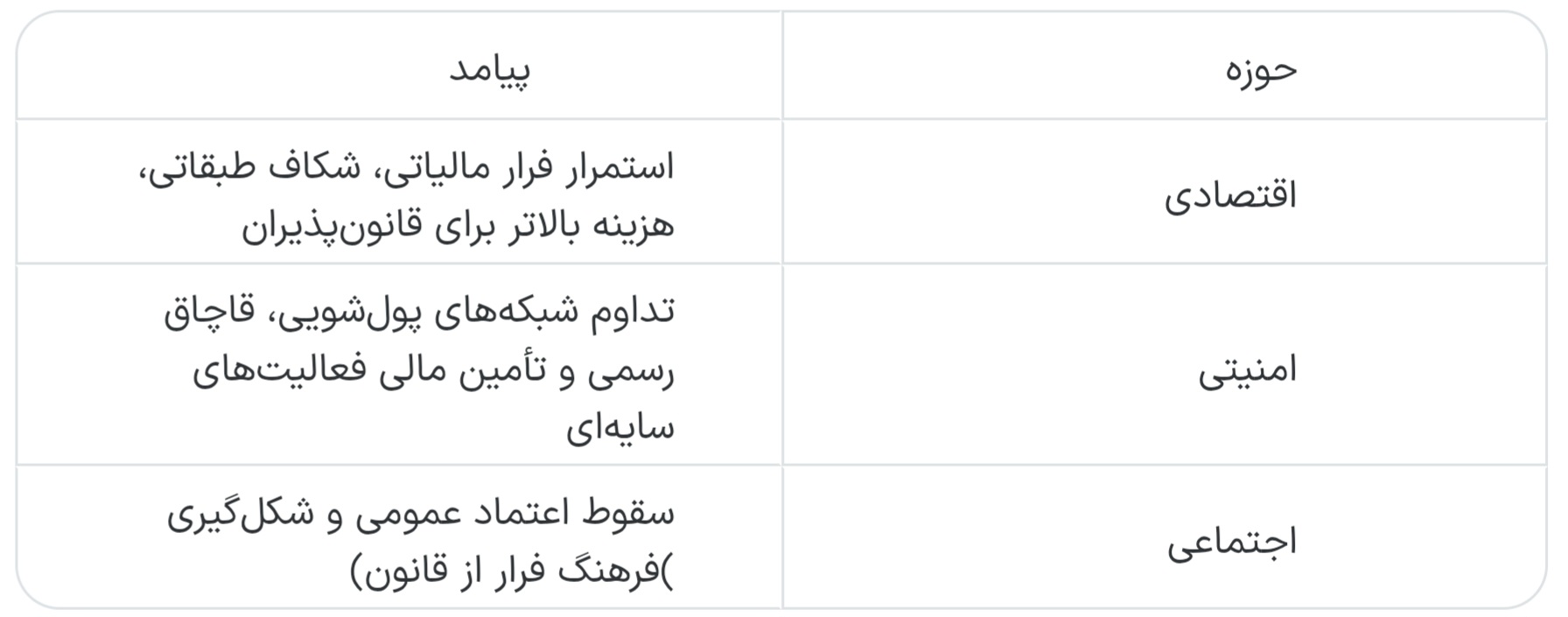 ایجاد اقتصاد دوگانه و بیاعتمادی عمومی | عدم رعایت زمانبندی و نبود گزارش رسمی | وزارت اقتصاد | اجرای کامل سامانه در مهلت قانونی | 1 |