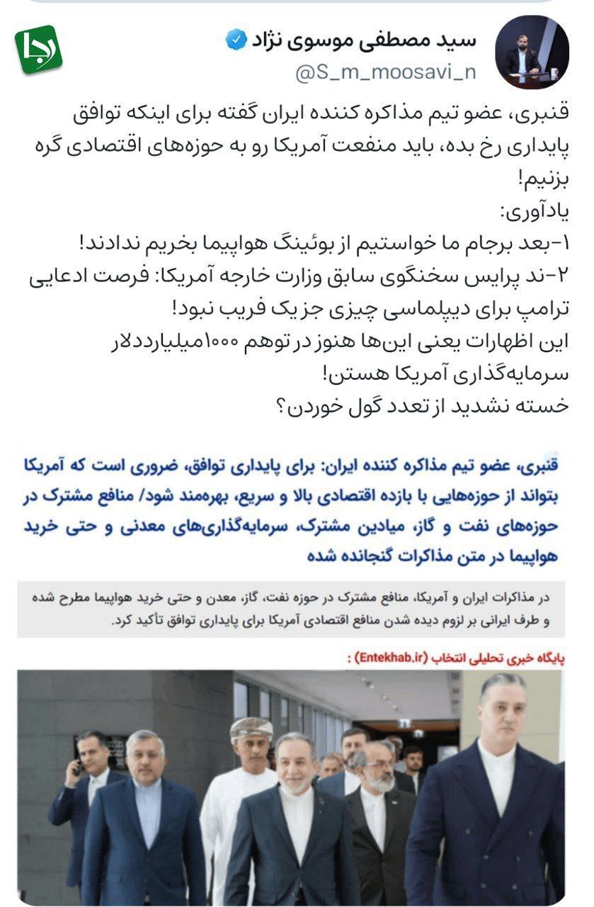 سید مصطفی موسوی نژاد-رجانیوز: در خبرها آمد قنبری، عضو تیم مذاکره کننده ایران گفته برای اینکه توافق پایداری رخ بده، باید منفعت آمریکا رو به حوزههای اقتصادی گره بزنیم!