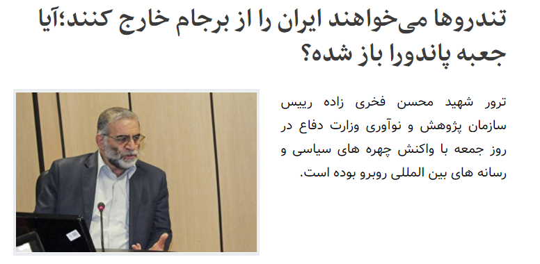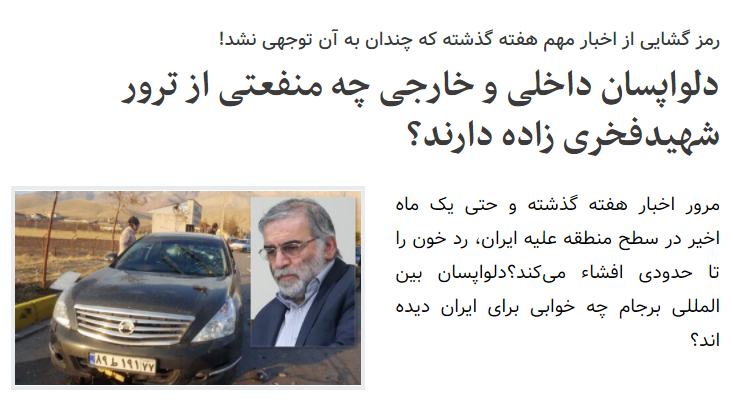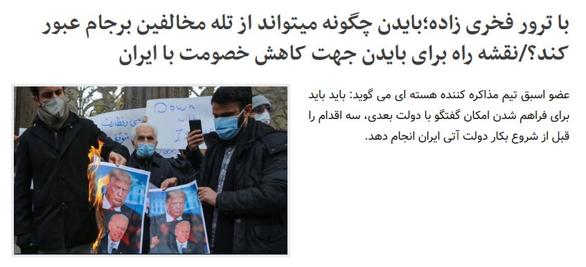 این سایت خبری اصلاحطلب در مطلبی با عنوان «با ترور فخری زاده؛ بایدن چگونه میتواند از تله مخالفین برجام عبور کند؟» علاوه بر تخریب منتقدین تفکر غربگرایی، نکاتی را بر شمرد که بایدن میتواند برای کشاندن ایران پای میز مذاکره استفاده کند.